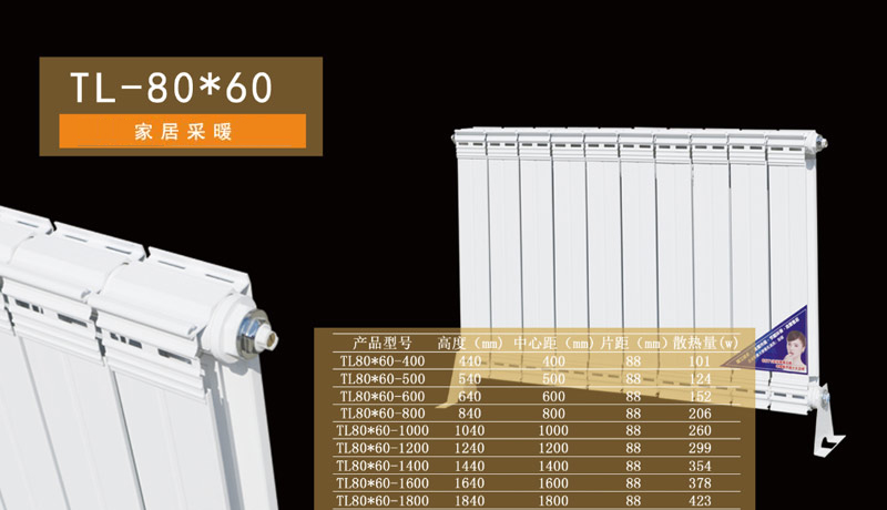 铜铝复合散热器80X60 我公司铜铝复合散热器产品所有水道采用99.99%纯度无氧管,铝热片采翅用高级6063-15型原生铝型材,用引欧盟领先水准的无 间结合涨管技术,将铜管和铝翅片双金属动化无间隙平滑挤压,同步消除钢管记忆效应,形成紧密无缝结合,具有热阻用了源德国领先的全自动钻孔翻一次成型工艺,合成了集热管,具有成型质量离,无毛刺,无纹。表面光滑的特点,使料与母体有了更大接触面积,确保最佳焊接状态。中英森马散热器品质独特,让家居采暖更有保障! 商品参数